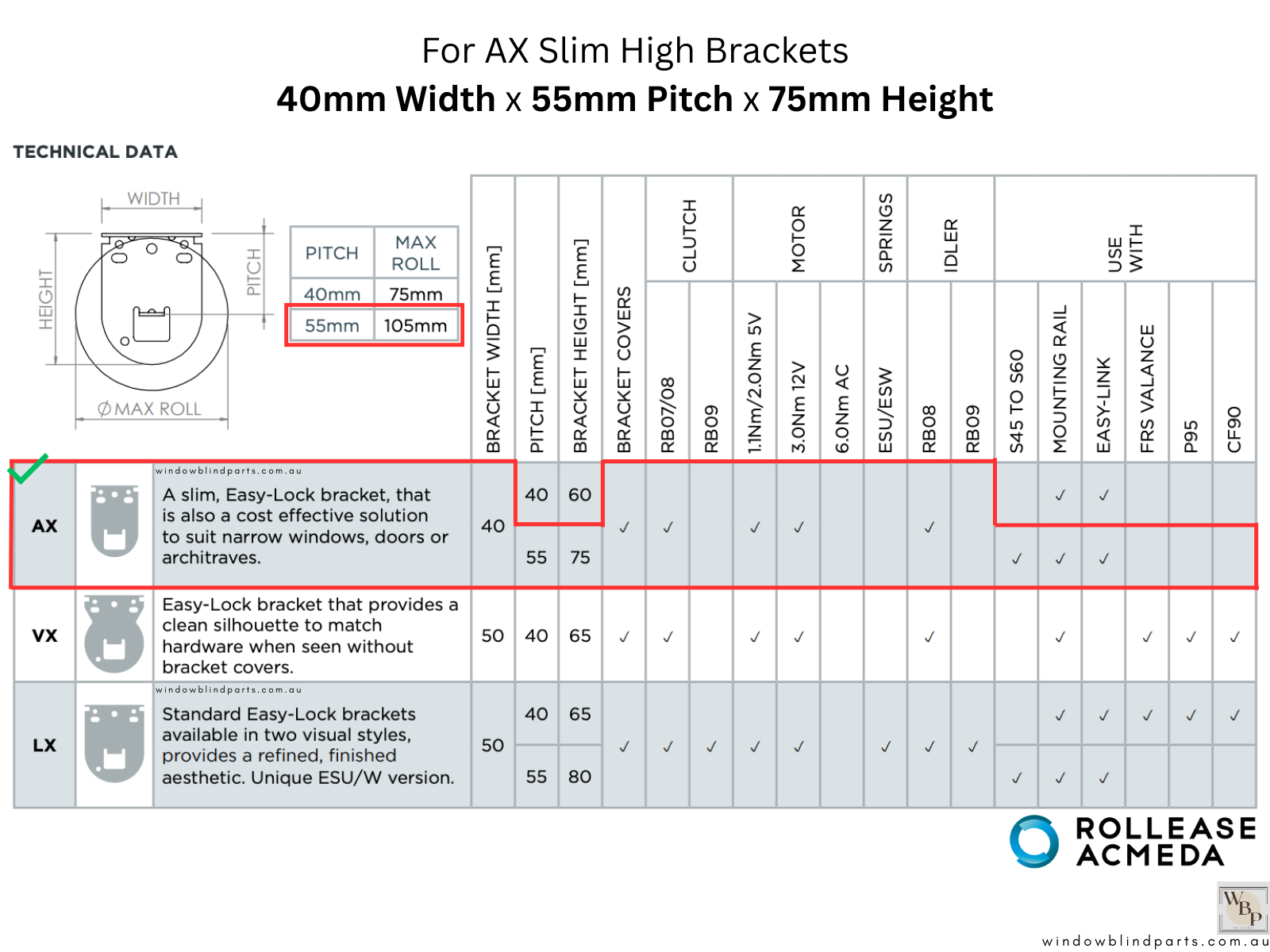 Fits Acmeda LX Slim High brackets. 40mm width x 75mm height