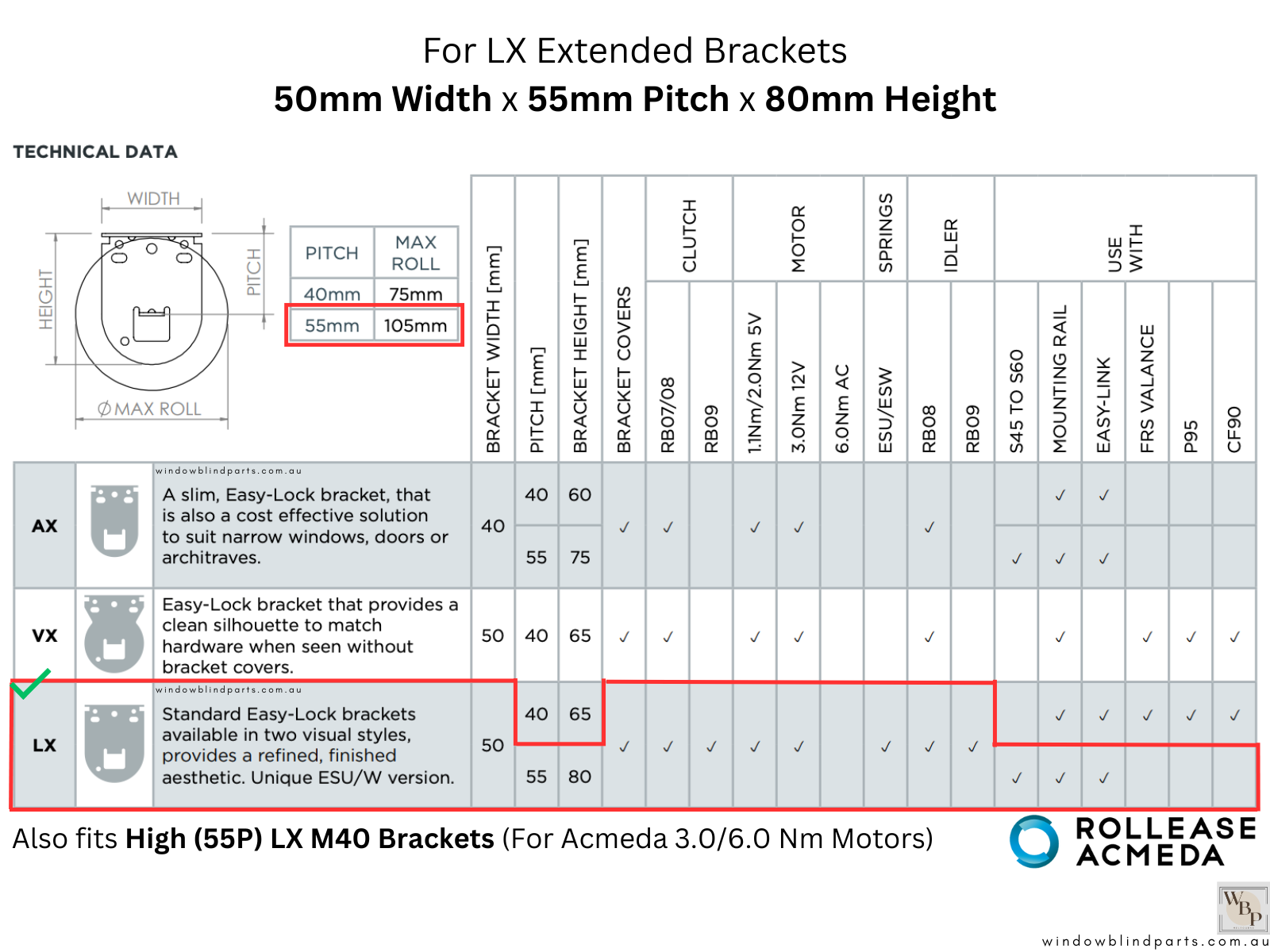 Fits Acmeda LX Extended brackets. 50mm width x 80mm height