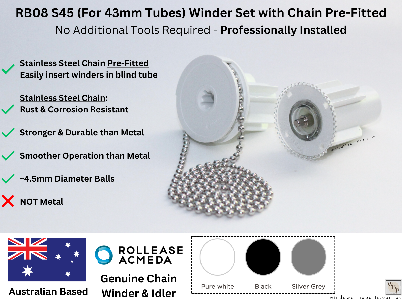 Genuine Acmeda RB08 S45 (For 43mm Tubes) Winder w/ Stainless Steel Chain Pre-Fitted
